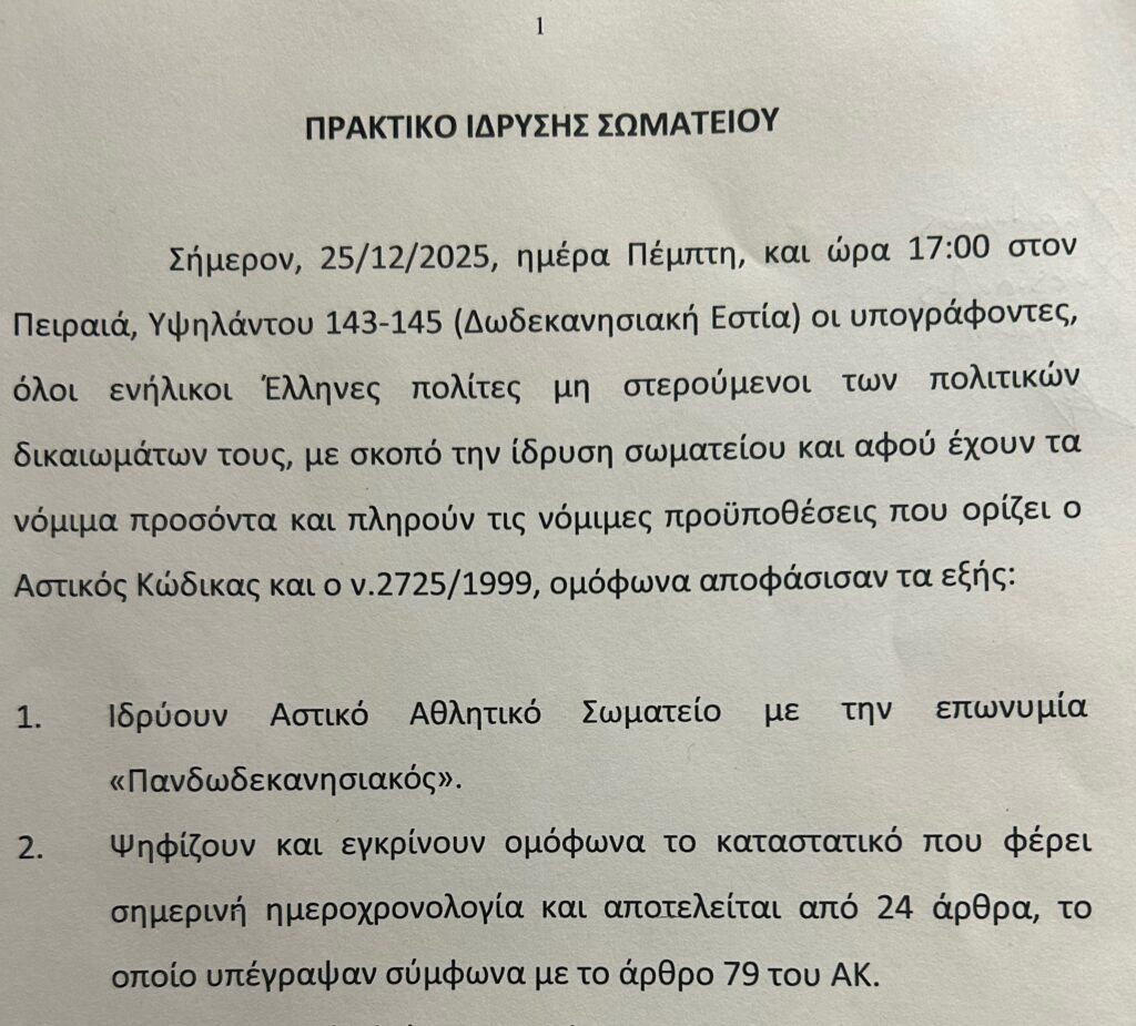 Ιδρύεται στον Πειραιά, σήμερα 25 Δεκεμβρίου 2025, Αστικό Αθλητικό Σωματείο με την επωνυμία ”Πανδωδεκανησιακός”, με εδρα την Ρόδο. Οι ιδρυτές Δωδεκανήσιοι νέοι δηλώνουν πως σκοπός του νέου αυτού αθλητικού σωματείου είναι να δράσει υπέρ της εμπέδωσης ενός πανδωδεκανησιακού πνεύματος μέσω του αθλητισμού. Ο εμπνευστής της ιδέας Χατζόπουλος Χαράλαμπος, και νονός του Πανδωδεκανησιακού, με καταγωγή από το Όθος Καρπάθου, αναφέρει πως ”Ο Πανδωδεκανησιακός αποτελεί το επιστέγασμα μιας προσπάθειας νέων ανθρώπων με κοινές αξίες και αρχές, και με ένα όραμα για τα νησιά μας. Προσδοκούμε να αναδειχθεί σύντομα σε ένα κοινό όραμα και όλων των Δωδεκανησίων!”